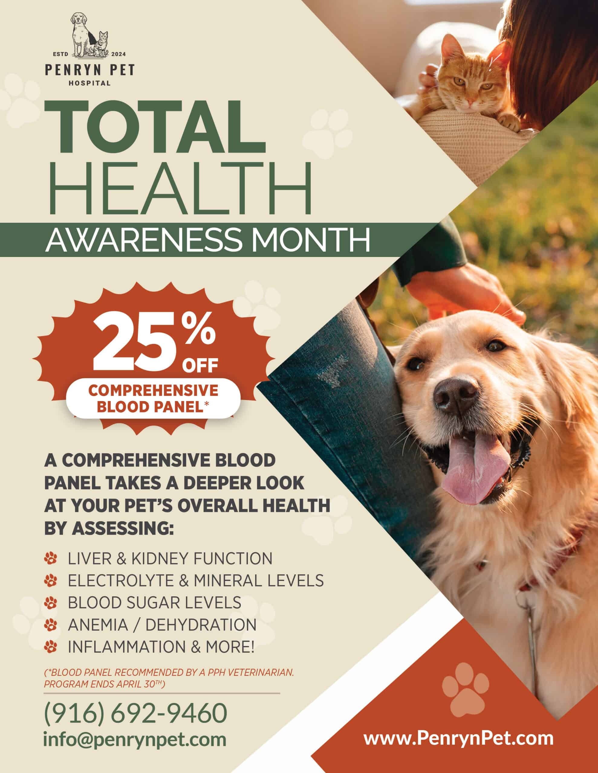 APRIL PROGRAM TOTAL HEALTH AWARENESS MONTH Just like our human doctors recommend annual blood work for us, it is also recommended for cats and dogs. A simple blood panel can help detect early changes in your pet’s health, sometimes even before there are external symptoms! To help make this more affordable for pet parents, we are providing 25% Off Comprehensive Blood Panels! This program is limited to the first 40 pets or April 30th… whichever comes first If you have concerns about your pet’s health or if you’d like to establish a baseline of blood work for them, give us a Call or Email Us Today! Contact Us