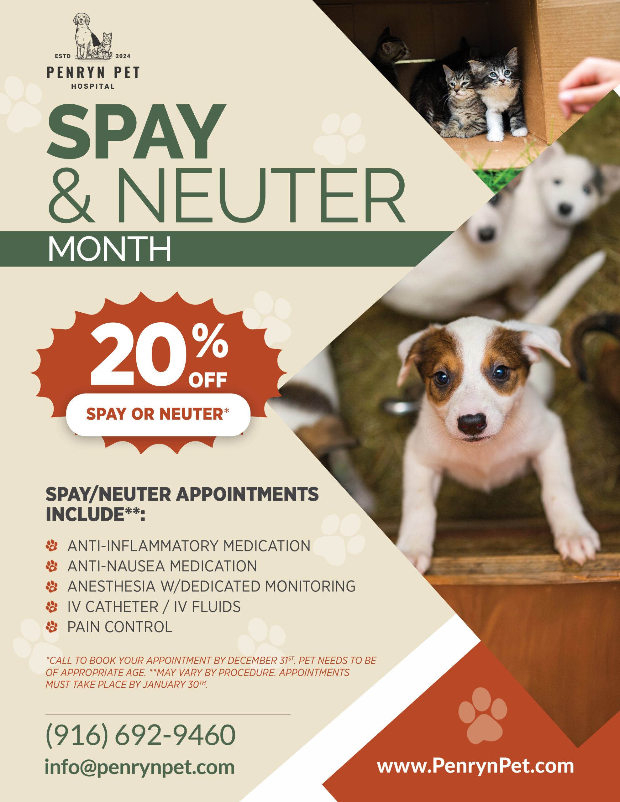 Thinking about getting your pet spayed or neutered? Now’s the perfect time—we’re offering 20% off all spay and neuter procedures!